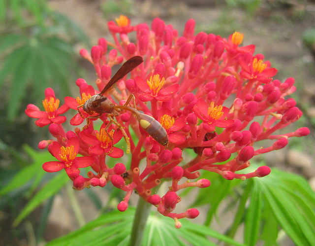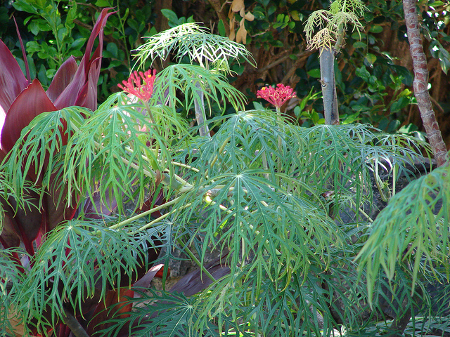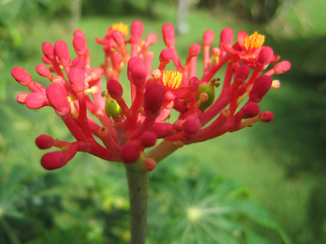 الجاتروفا المرجانية شجرة أو شجيرة صغيرة تشبه النخيل في هيئتها، ذات مظهر مبهرج جداً وزهور مرجانية فاقعة اللون تتفتق باستمرار. الشجرة سريعة النمو للغاية، وتنمو بسهولة من البذور، كما تتحمل الجفاف بشكل جيد. بذور الشجرة تحتوي على 30% من الزيت الشبيه لزيت الجاتروفا كوركاس.