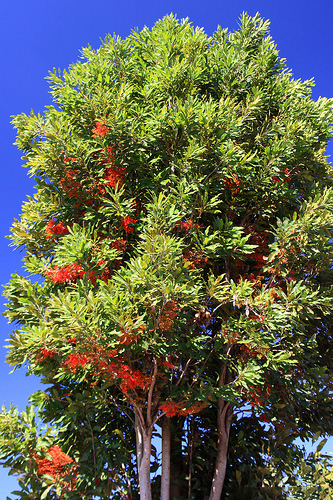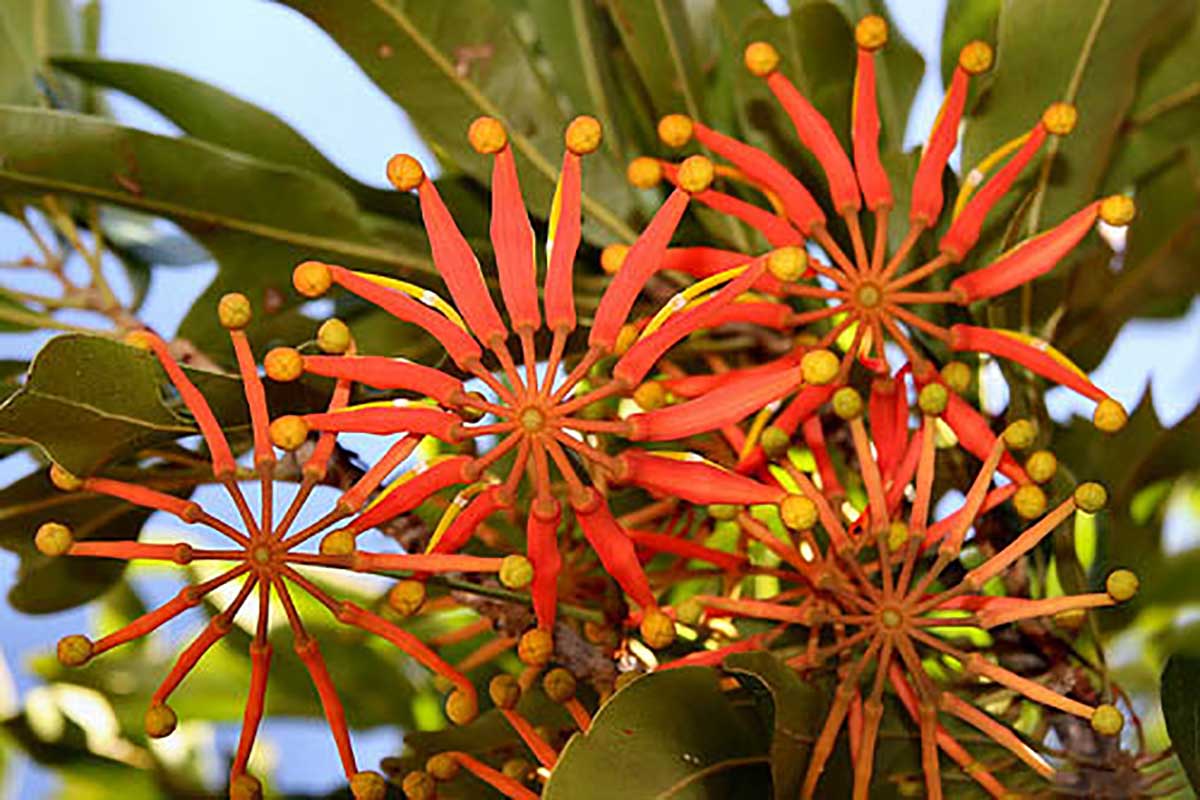 أخذت شجرة عجلة النار اسمها من تكوين ولون النورات فيها، حيث أن الزهور الصغيرة تشكل مجموعات على هيئة عجلة. انها بدون شك واحدة من اكثر أشجار استراليا تميزاً.